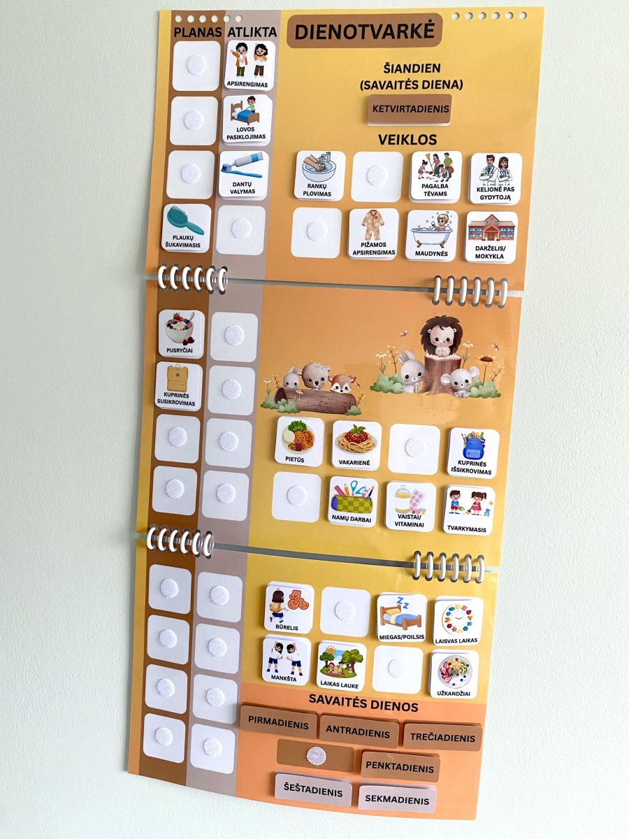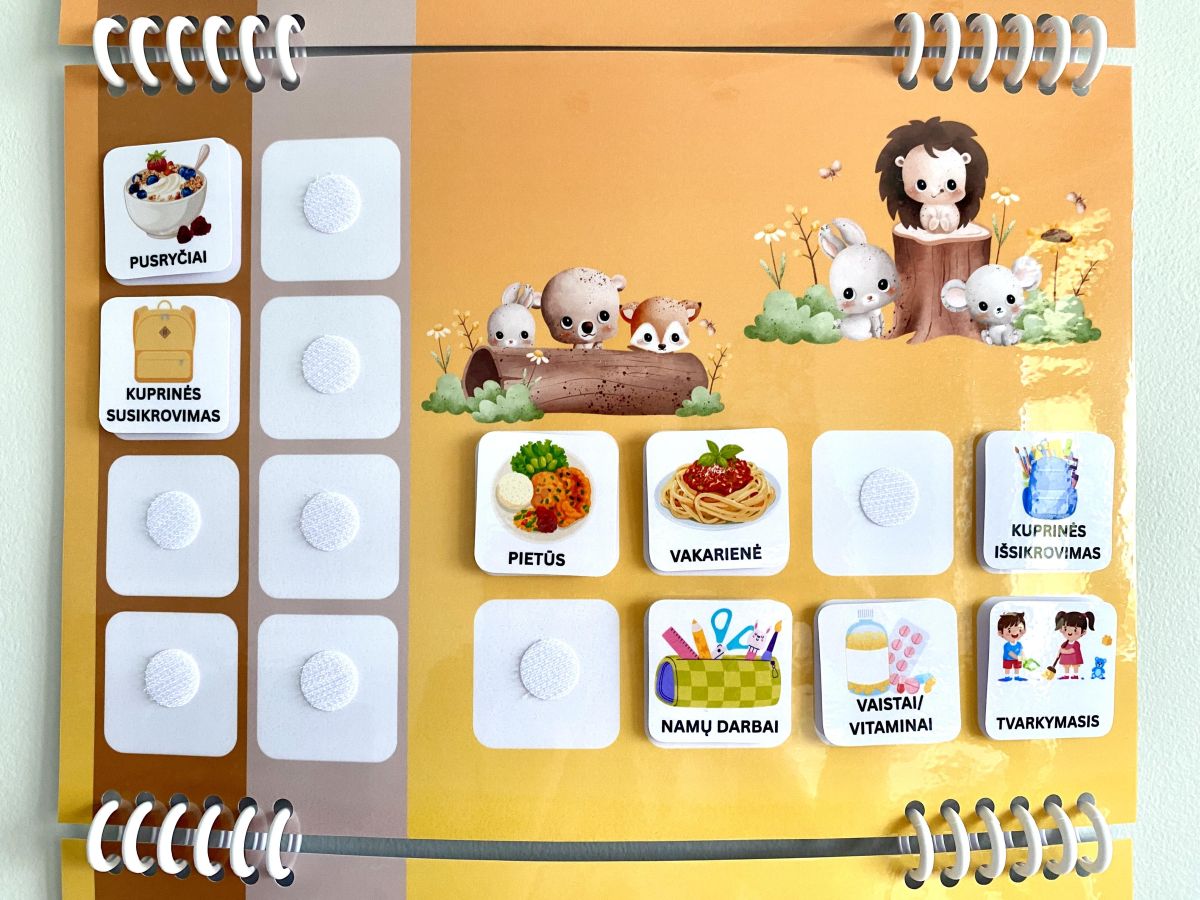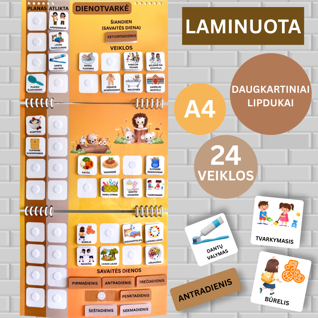 Storai laminuota A4 formato dienotvarkė su daugkartiniais lipdukais. 24 veiklos lipdukai, leidžiantys vaikui planuoti savo dieną ir pažymėti atliktas užduotis ✅
